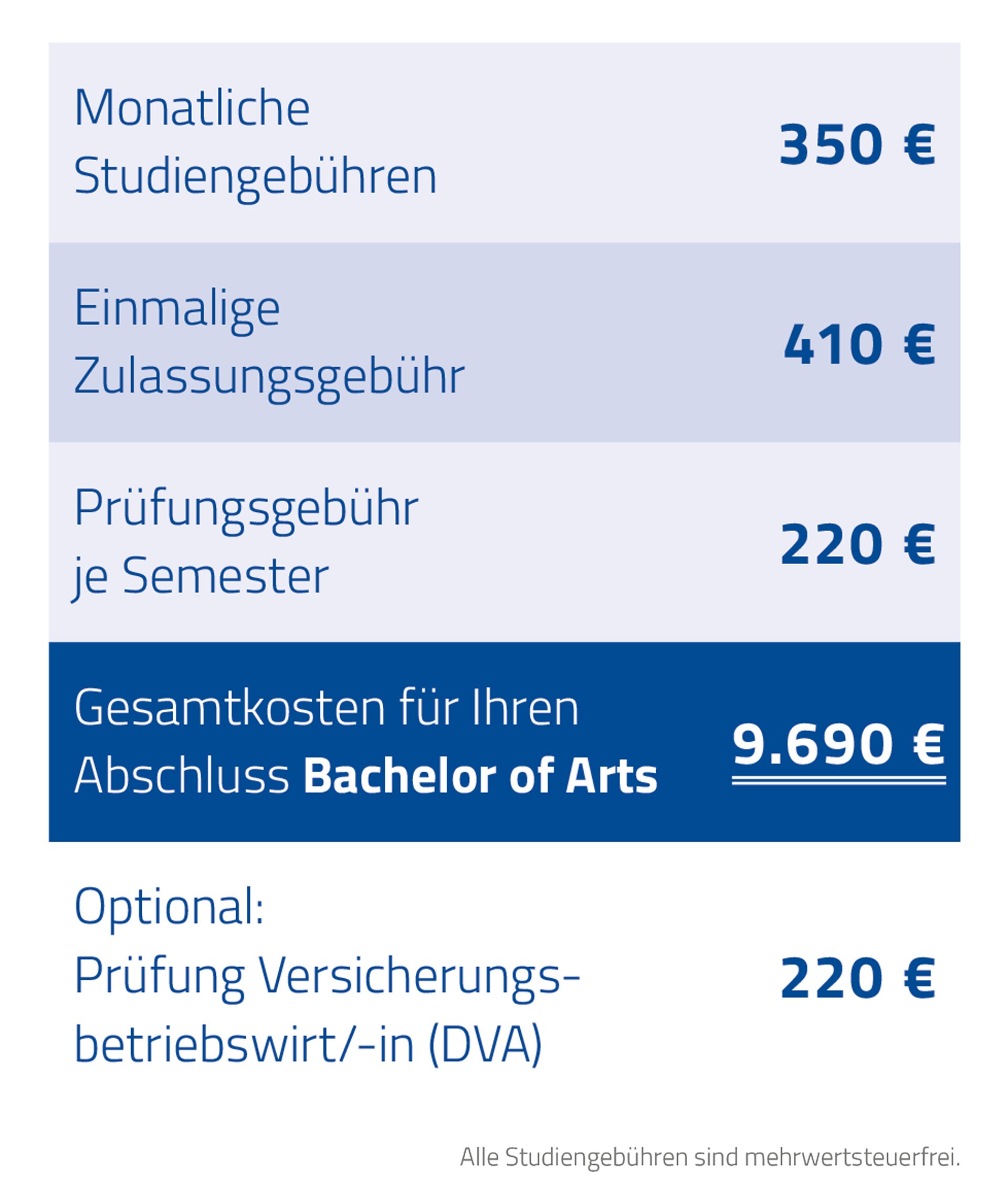 - Mit Vorqualifikation Versicherungsbetriebswirt/-in (DVA) belaufen sich die Studiengebühren auf 3.600 €.